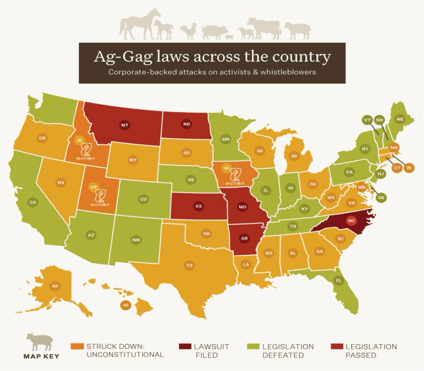 What are Ag-Gag Laws? Ag-Gag Laws are laws enacted in various states that forbid undercover videos or photography of activity on factory farms and slaughterhouses without the consent of the owners. [1] Animal rights activists or whistleblowers frequently conduct undercover investigations and illicit recordings within agricultural operations to uncover unethical or unlawful actions; these laws are intended to punish these activities. [2] As of 2023, Arkansas, Iowa, Missouri, Montana, and North Dakota have Ag-Gag Laws in place. [3] The laws have been overturned in some states, subsequently determined to be unconstitutional, or are still being contested. [4] There continues to be an ongoing challenge for the courts and legislatures on how to balance the right to free speech, press, whistleblowing, and animal rights against the protection of private property and agriculture industry practices.